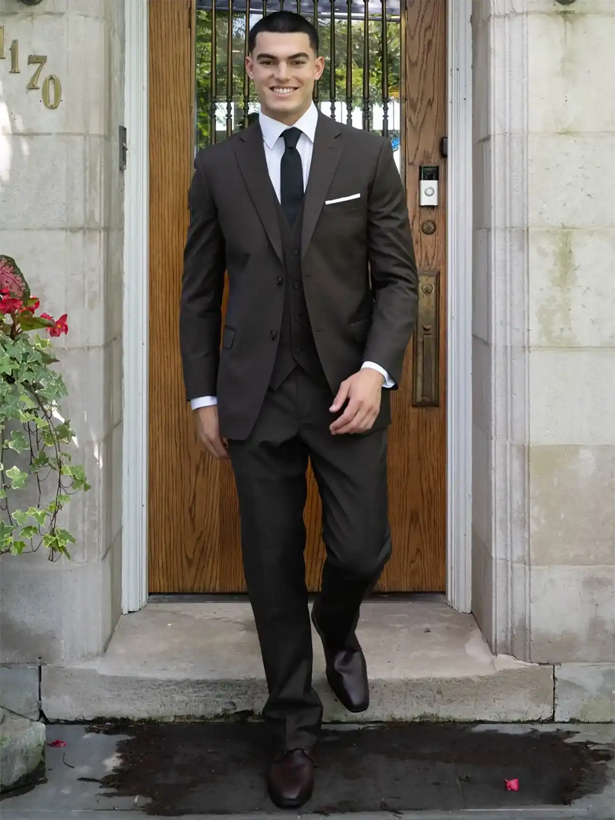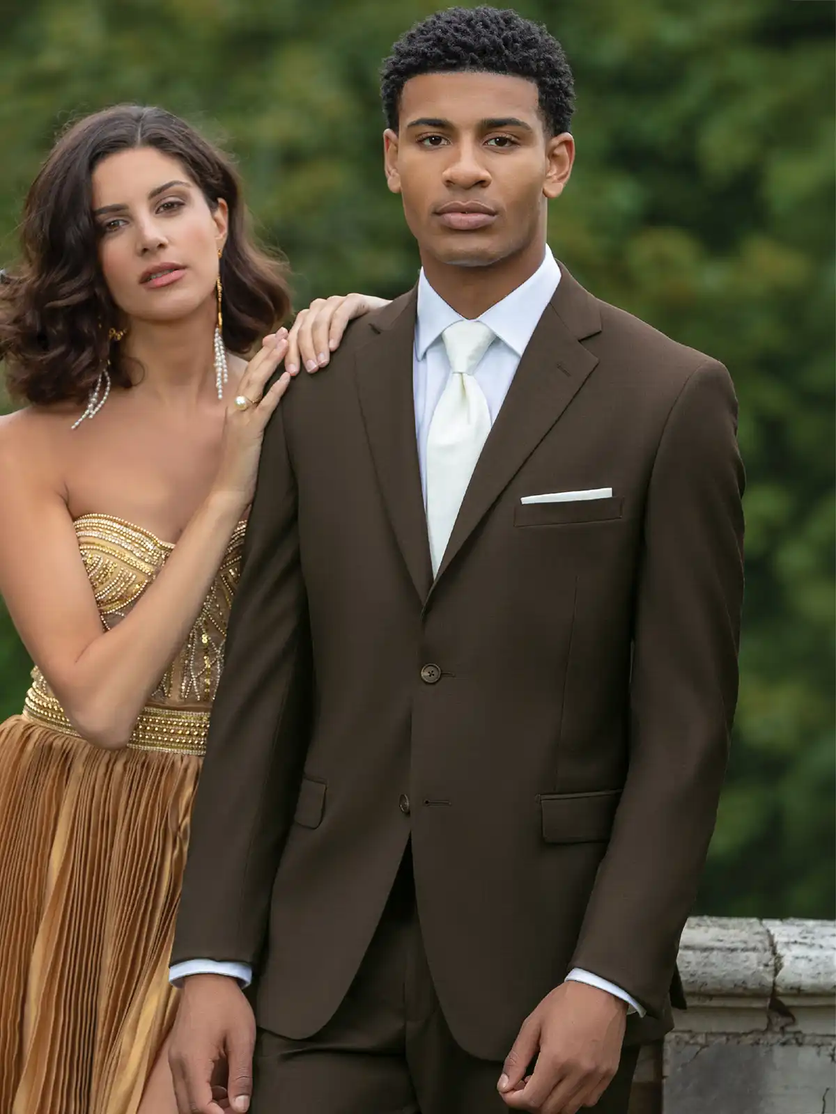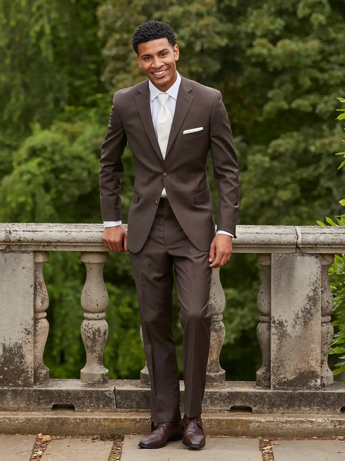 This Brown Suit is made of lightweight 100% worsted wool. It’s a trim fit jacket for the modern look featuring a self-notch lapel and a top collar. Two-bone button front with sided vents and flap pockets makes this suit so high fashion.