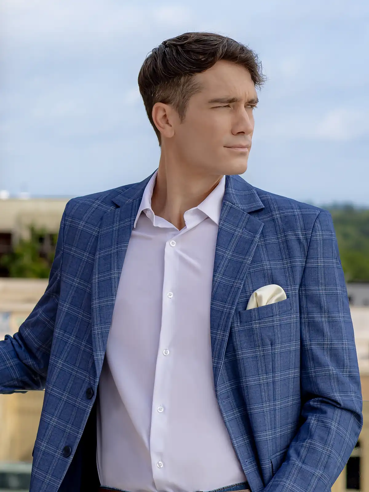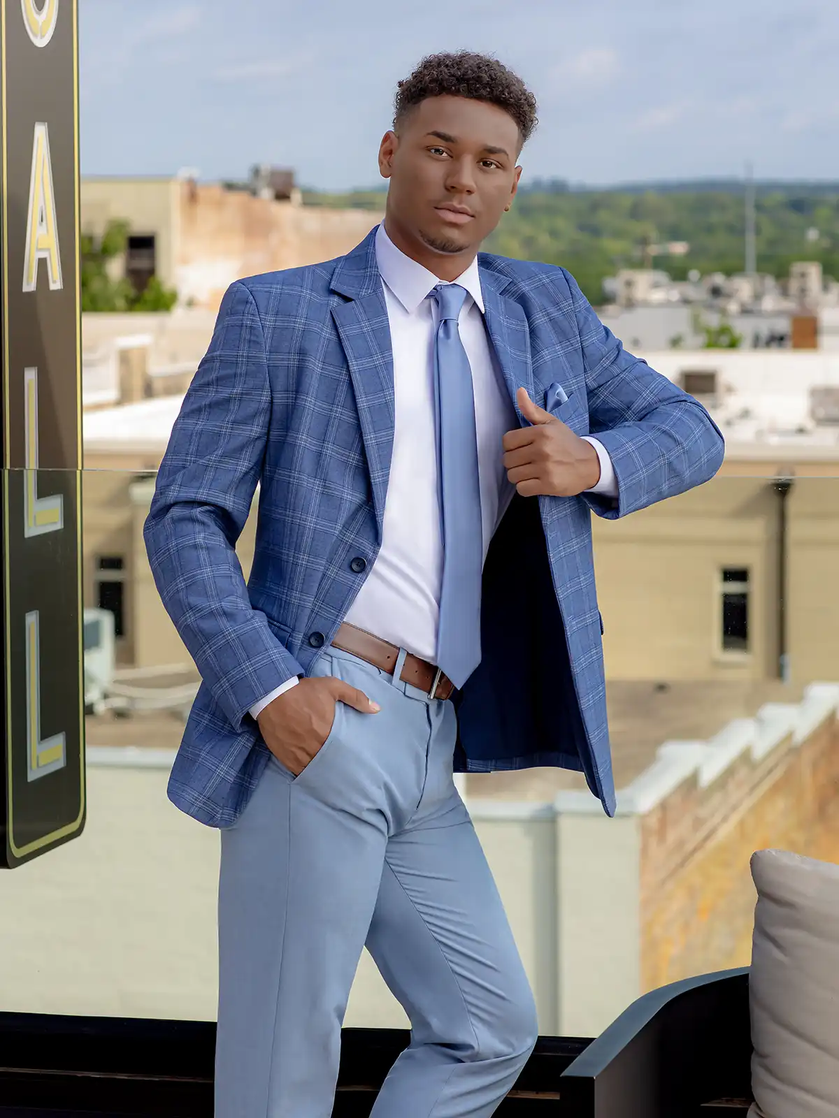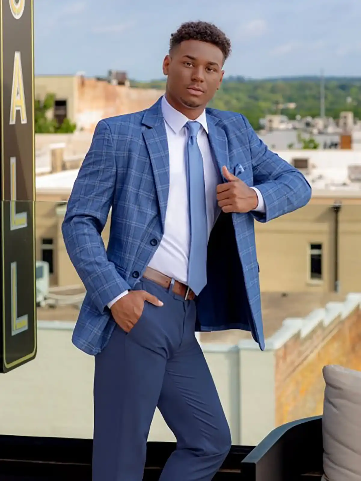 The Ted Stanford Indigo Metro Tonal Plaid is a trim-fit jacket designed to pair with multiple pant options. Featuring 2 button jacket with side vents. You can dress it up with navy, indigo, or platinum pants and a coordinating tie or bow tie. You can dress it down with khakis or jeans. This is a great 2nd look option for a wedding or any special event.